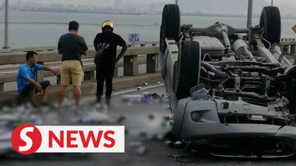 Buzzkill Crates Of Beer Spilt On Penang Bridge After Delivery Truck Overturns Video Dailymotion